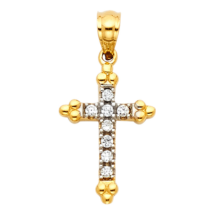 14K Gold CZ Cross Charm Pendant with 1.5mm Flat Open Wheat Chain Necklace