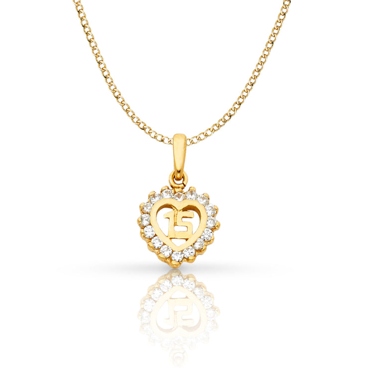 14K Gold Quinceanera Heart CZ Pendant with 2mm Hollow Cuban Bevel Chain